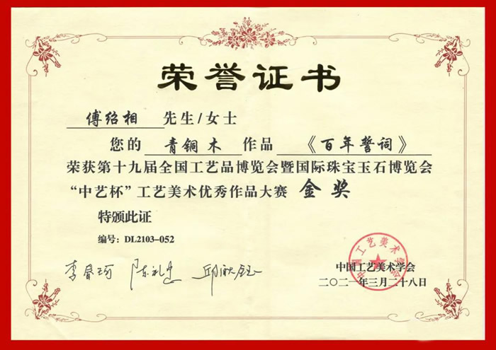 近日,在第十九届全国工艺品博览会暨国际矿物珠宝玉石博览会上,九三学社潍坊市社员、山东华艺雕塑艺术股份有限公司董事长傅绍相创作的“庆祝中国共产党成立一百周年”青铜作品《百年誓词》荣获第十九届全国工艺品博览会暨国际珠宝玉石博览会“中艺杯”工艺美术优秀作品大赛“金奖”。