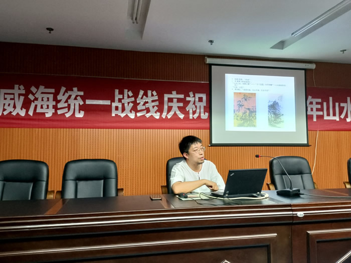 6月18日,中共威海市委统战部在威海市美术馆举行“风雨同舟感党恩 同心奋斗跟党走-威海统一战线庆祝建党100周年优秀书画作品展”,中共威海市委常委、统战部长梁金光出席了作品展。九三学社威海市委员会艺术研究院院长、山东大学艺术学院国画系主任安祥祥应邀作“威海统一战线庆祝建党100周年山水画艺术讲座”。 安祥祥院长讲座的题目是《山水画概说》。他从中国传统山水画讲起,娓娓道来。“中国山水画不仅仅对于创作者提出了要求,对于欣赏者同样提出了极高的要求。如果欣赏者没有文人的修养,没有对自然的真实情感,没有对出世态度的深入理解,那么他们是无法真正领会山水画中的诸多深刻内涵的。” 安祥祥通过南朝宗炳的“卧游”说,宋朝郭熙 “山水之好,烟霞之癖” 与“不下堂筵,坐穷泉壑” 之间的逻辑关系,道出山水画的艺术功能和创作动机。然后他从神与逸、雄与秀、苍与润、浓与淡、疏与密、虚与实、三远法等方面,精要而全面地讲述了山水画作品的欣赏角度和欣赏方法。 安祥祥在讲座中谈到:“从某种意义上讲,中国文人对于山水画的这份情感反映出了人类内心深处的普遍追求。”他还将传统山水画与花鸟画做了一定的联系说明:“在中国的传统绘画题材中有著名的四君子题材,它们是文人对于高洁人格进行表述的最佳载体,而山水画则是文人对于出世态度和隐居理想进行寄托的最佳所在。”最后,安祥祥谈到了他对于当代山水画创作的一些看法:“如今的山水画创作不仅仅局限于士气的表达,画家们还会将很大的精力用在技巧的开拓、发明以及当代性、现实意义等思想的展示。这种变化源于大的文化背景的改变,但至少在一部分作者那里,传统的审美判断还是能够延续下来的。” 大家一致认为,安祥祥院长的讲座既专业性强,又深入浅出,普遍感觉受益匪浅,是一场艺术鉴赏的盛宴。(九三学社威海市委员会 曲兴) |