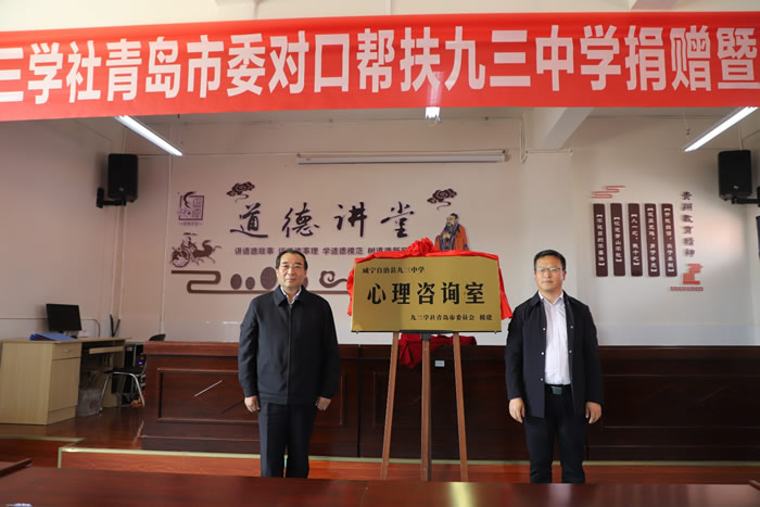 5月13日,“九三学社青岛市委对口帮扶九三中学捐赠暨签约仪式”在贵州省毕节市威宁彝族回族苗族自治县九三中学举行。全国人大常委会委员、九三学社中央副主席丛斌,贵州省毕节市威宁彝族回族苗族自治县县长邓林为九三学社青岛市委捐赠的“心理咨询室”揭牌。九三学社青岛市委驻会副主委于鹏,青年工作委员会主任赵玥博、副主任张国良、委员孙静,机关三级调研员刘春玉一同参加了活动。