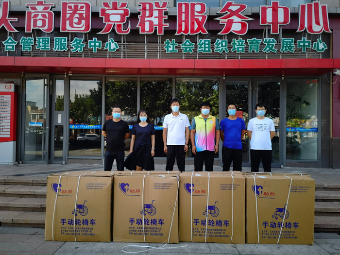 8月21日,威海市九三学社社员戴建新所属企业荣成中康医院,为荣成市雁筑港城社工中心无偿捐赠8台轮椅,港湾街道党工委班子成员刘力副主任和中心负责人李二孩接受捐赠。