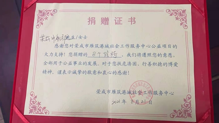 在组织全院职工积极参与“慈善一日捐”活动的基础上,为两个贫困家庭各给予万元救助;参与了“社会妈妈”、“绿满荣成 美丽乡村”等活动,捐款 3万元;联手市红十字会开展“扶残助残,有你有我”送温暖活动。2016-2021年为全市慈善事业捐助达14.2万元。曾获评2017年度荣成市“志愿者+”最美爱心人士,并被评为十大“慈善捐助突出贡献个人”,市长刘昌松亲自颁奖,成为其时唯一荣获两项殊荣的个人。在威海市残联、广播电视台联合举办的“同在蓝天下,共筑中国梦”2018助残日主题公益评选活动中,荣成中康医院获评为“十佳助残先进集体”。新冠疫情发生以来,迅速组织志愿团队投入到疫情防控第一线,并通过各种渠道捐款捐物,总价值达4万余元。