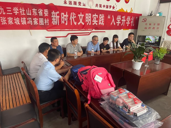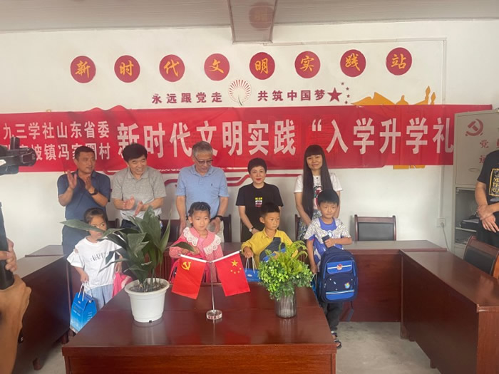8月27日,山东省人大常委会委员、九三学社山东省委专职副主委宋尚桂到社省委“助力乡村振兴县区行”对口帮扶的沂源县张家坡镇冯家圈村出席“新时代文明实践入学升学礼”及九三学社山东省委向在校学生捐赠学习用品仪式并讲话。九三学社山东省委办公室主任宋广伦,九三学社社员、山东裕广悦自动化设备有限公司董事长刘艳和社淄博市委、沂源县委统战部、中共张家坡镇委领导,全体新生和家长代表们共同参加了此次活动。 宋主委在仪式讲话中说,九三学社是以科技、教育界高中级知识分子为主的中国特色社会主义参政党,是同中国共产党风雨同舟、荣辱与共的亲密友党。发挥九三学社自身优势,开展各种形式的助力乡村振兴活动,是我们的光荣使命和社会责任。他勉励学子们通过这次仪式,增强使命感和责任感,传承优秀传统文化,激发爱党爱国情感,未来的求学之路能够走得更广阔、更顺畅,努力学有所成,成为未来国家建设的栋梁之才。他指出这次参加冯家圈村“入学升学礼”是社省委“助力乡村振兴县区行”系列活动的组成部分,今后社省委将继续为助力张家坡镇的乡村振兴和爱心助学贡献我们更多的力量。