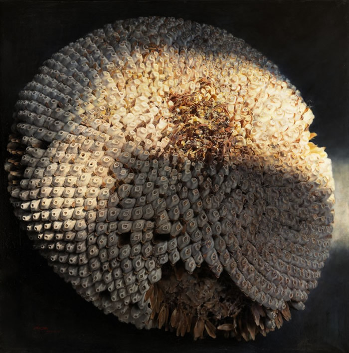 向日葵作为一种常见的植物,往往被作为热情、生命感的象征。赵军笔下的向日葵色彩斑斓,形状诡异抽象,萦绕着画家内心对真诚态度的渴望;在他的描绘中,向日葵用生命的热情倾注着对太阳的忠诚,带着太阳赋予的温度,傲然活在属于它的季节,默默地生根、开花、结果。然后,脱下金黄色的外衣,以饱满的成熟与大地共绘秋图,他的画面中我们看到的永远是葵花动人的丰韵与秋色的凝固,赵军以朴素的表达给季节以真实的支撑。希腊神话中有关向日葵的故事那么凄美,无论是凝望着赫利俄斯的克吕提厄那份痴情,还是追随阿波罗的克丽泰,都诠释了花语——沉默的爱。
