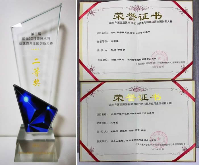 获奖的两个项目分别为“3D打印假体在骨肿瘤疾病治疗中的应用”与“3D打印导板及垫块在HTO中的应用”,项目由烟台山医院副院长、原社市委副主委常黎明及骨科大科主任孙涛、骨肿瘤科主任廖光军及其团队自主设计完成。