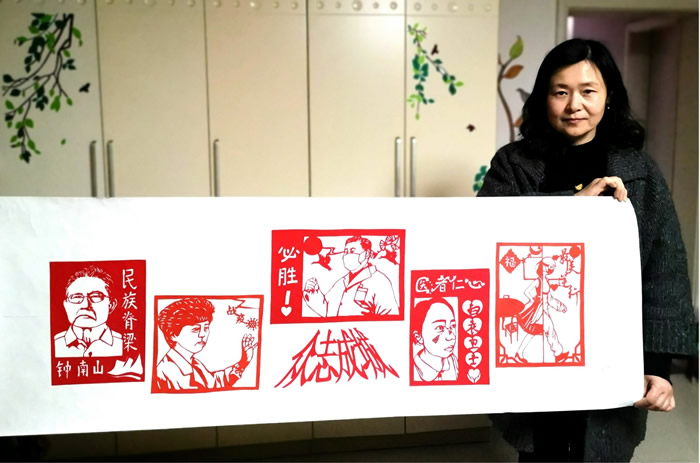 那年春节期间,新冠疫情开始爆发,举国上下众志成城抗疫,母亲夜以继日地创作与抗疫有关的剪纸,当看到她一幅接一幅地剪出作品时,我知道她又熬夜创作了。在心疼母亲的同时,我也拿起剪刀制作抗疫剪纸。我想用实际行动告诉母亲,不是她一个人在用剪纸艺术为抗疫助力,我也加入了,她可以不用太劳累。 在那段居家隔离的时光里,我将创作剪纸的心境写成了诗歌《剪疫曲》: 银剪熠熠,素手相依, 无心镂刻春意, 要剪那抗疫英雄将平安系。 红纸殷殷,诉情依依, 双目泪珠渐溢, 在剪那青春发丝短无梳篦。 丹心所寄,携手抗疫, 纸薄却漾涟漪, 要剪那众志成城齐心协力。 银剪熠,红纸殷,丹心寄, 剪出黄鹤振双翼, 剪出春龙屠冠毙, 剪出中华大地凯歌四溢!