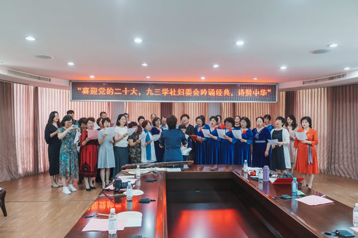 最后,全体演职人员集体合诵《鹿鸣》,并合唱《我和我的祖国》。朗诵现场大家热情澎湃,激情高涨,点燃了九三人永远跟党走、同心同向为国家贡献青春和力量的坚定信心和志向。 社青岛市委会副主委王霞在总结发言中感谢妇委会等专委会和基层组织牵头组织的这么有意义的活动,感谢社员们百忙中牺牲休息时间积极参加,踊跃表演。搭建这样的平台,社员们可以在演出中陶冶情操、传承经典,推广优秀传统文化,为文化强国贡献力量。(社青岛市委会 纪香清 刘晓琳 杨晓梅 李颖 宋金枝)