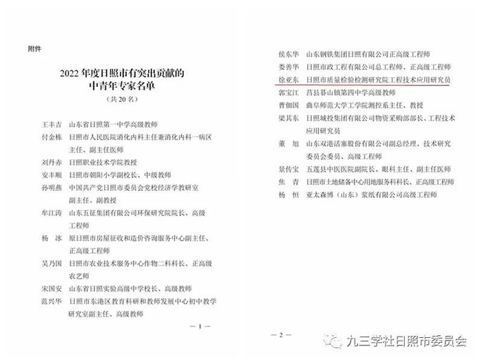 9月5日,日照市政府公布了2022年度日照市有突出贡献的中青年专家名单,授予20名同志“日照市有突出贡献的中青年专家”称号,其中九三学社社员徐亚东入选。日照市有突出贡献的中青年专家,是日照市人民政府设立的专业技术人员专项荣誉。