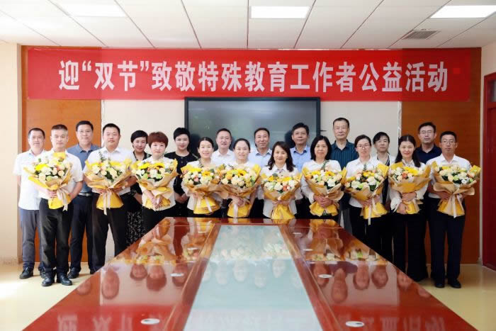 活动中,大家为10位优秀教师送上代表节日问候的鲜花,向他们为特殊教育事业的付出表达敬意,社员企业曼都芮颜医疗还为学校捐赠了定制款150件教学制服。(社东营市委供稿)