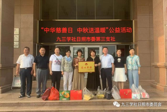 9月5日是中华慈善日,中秋佳节也即将来临。九三学社日照市委员会组织部分社员到日照市救助管理和社会福利服务中心开展“中华慈善日 中秋送温暖”公益活动。 社员们共同出资为该中心的特困供养人员、孤弃儿童和流浪乞讨人员送去了水果、书籍、月饼等节日礼品。九三学社日照市第三支社被日照市救助管理和社会福利服务中心授予“爱心单位”称号。