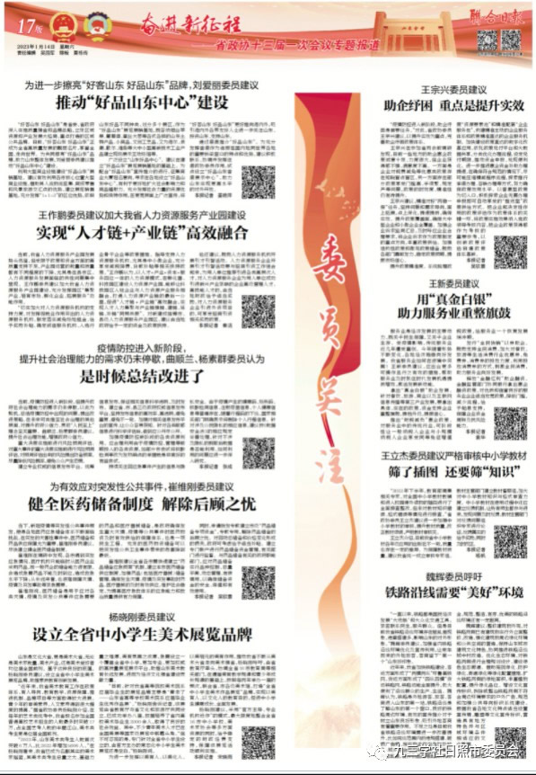 1月12日上午,山东省政协十三届一次会议在山东会堂隆重开幕。山东省政协委员、九三学社日照市委会主委、日照市人民医院院长崔维刚,经过前期深入调研,结合山东省实际,向大会提交了2项提案,内容主要涉及科技创新和医药储备相关内容。1月14日,《联合日报》分别刊登了崔维刚的2件提案。