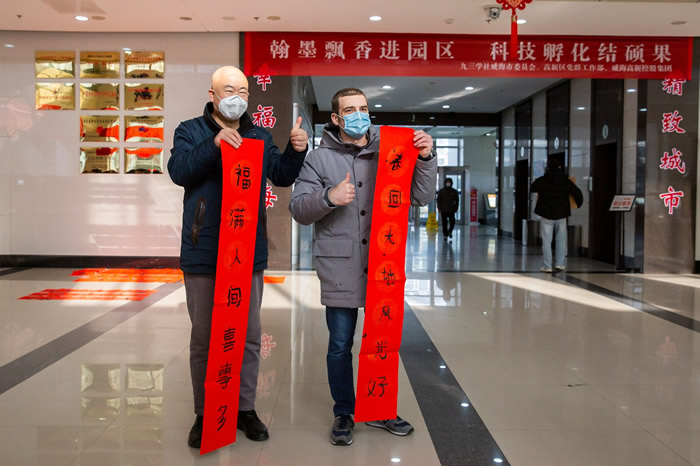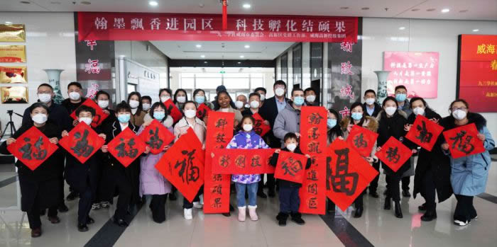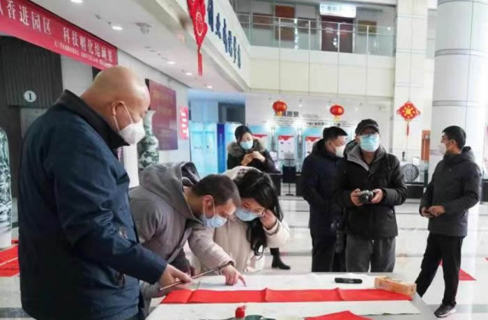 为弘扬中华优秀传统文化,回馈威海园区企业。2023年1月14日,正值阴历小年,九三学社威海市委员会、九三学社威海市直支社、九三学社威海市委员会艺术研究院组织书法家走进威海高新控股集团下属科技孵化园,联合举办“翰墨飘香进园区 科技成果展新颜”为企业送春联活动。