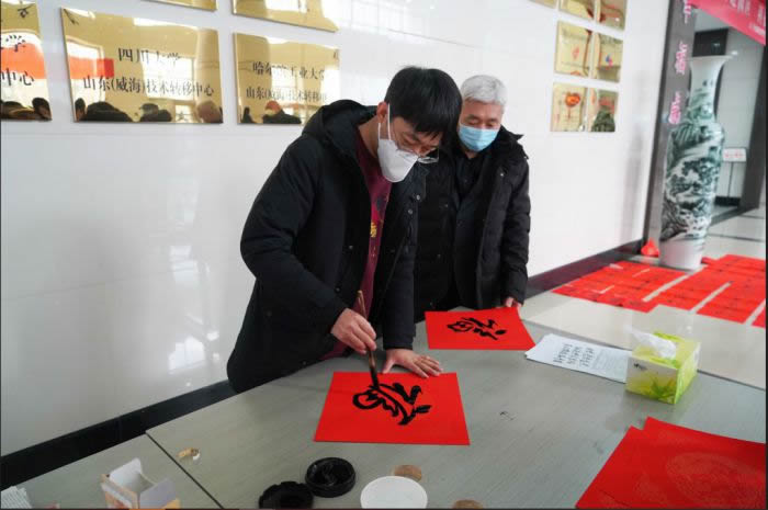 本次活动由九三学社威海市委员会委员、市直支社主委周华,九三学社威海市艺术研究院院长安祥祥带队,九三学社威海市委员会艺术研究院院士蔡国卿、时鹤鸣、邢维、张超、邢玉娜以及书法家高敬智、崔振琴等10余人参与活动。活动现场,书法家们奋笔挥毫迎新春,福赠春联祈平安,处处洋溢着其乐融融、喜庆祥和的节日氛围,共为科技孵化园50多家企业书写200余副春联,受到了社会各界的高度赞誉。