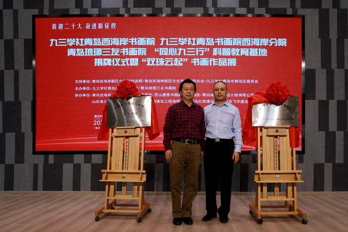 董华峰和琅琊三友书画院杨成才共同为书画院揭牌。(九三学社青岛市委会,文:胡四春;图:郎云鹏)