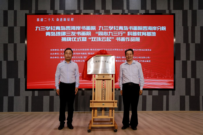 金秋送爽、丹桂飘香。 2022年9月23日上午,喜迎二十大 奋进新征程——九三学社青岛西海岸书画院、九三学社青岛书画院西海岸分院、青岛琅琊三友书画院、“同心九三行”科普教育基地揭牌仪式暨“双珠云起”书画作品展”在青岛西海岸新区浩辰科技文创园隆重举行。本次活动由九三学社青岛市委员会、青岛西海岸新区文化和旅游局、青岛西海岸新区文化艺术界联合会支持;九三学社青岛市黄岛区委员会、九三学社青岛西海岸书画院、青岛琅琊三友书画院承办;青岛西海岸新区文化馆、理贤书画院、灵山墨香书画院等协办。