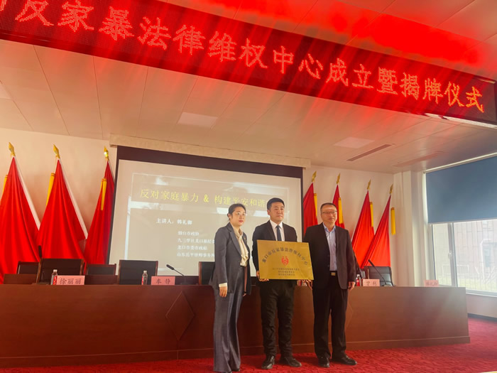 家暴问题频发怎么办? 群众家暴防范意识不强怎么破? 家暴维权难度大怎么解? 在龙口市政法委的大力支持下,九三学社烟台市委员会法治专门委员会与龙口市妇女联合会共同发起成立的龙口市反家暴法律维权中心,将为新时代反家暴工作提供新思路、开展新探索、做出新贡献。 3月3日,龙口市反家暴法律维权中心成立暨揭牌仪式隆重举行。九三学社烟台市委副主委、烟台大学法学院副院长王光明,龙口市妇联主席车静出席仪式并讲话。九三学社烟台市委副主委张桂德、龙口市妇联副主席徐丽丽参加仪式。
