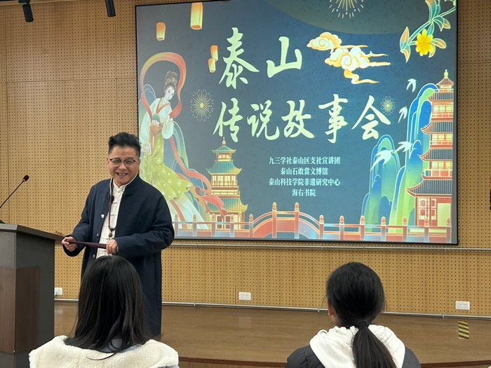 九三学社社员、泰山故事宣讲人夏照军进入校园开展泰山故事会演讲活动,对在校学生进行泰山文化的宣传,通过多层次、多方位的讲授,加深人们对泰山的了解,更深层次地体会泰山文化的包容和博大精深,加之石敢当人物的刻画更好地诠释了泰山平安文化的内涵以及传承石敢当精神的重要性。宣讲生动活泼、极具吸引力,得到师生和社员们的一致好评,大家意犹未尽,希望有更多的机会了解泰山文化。