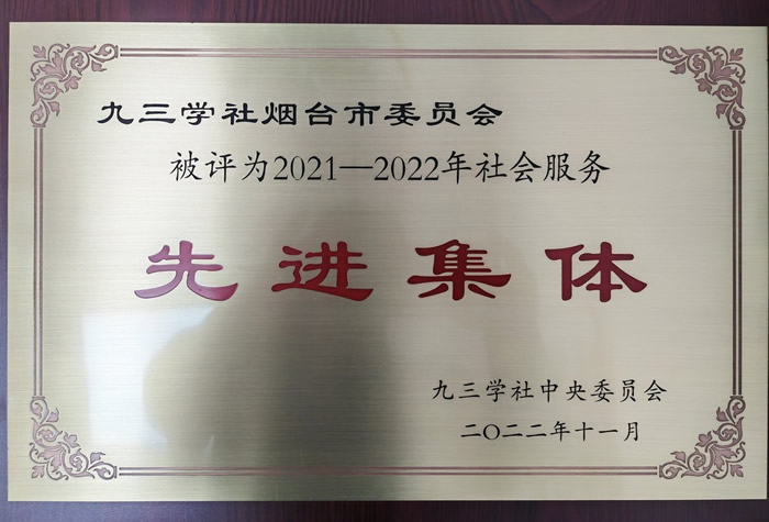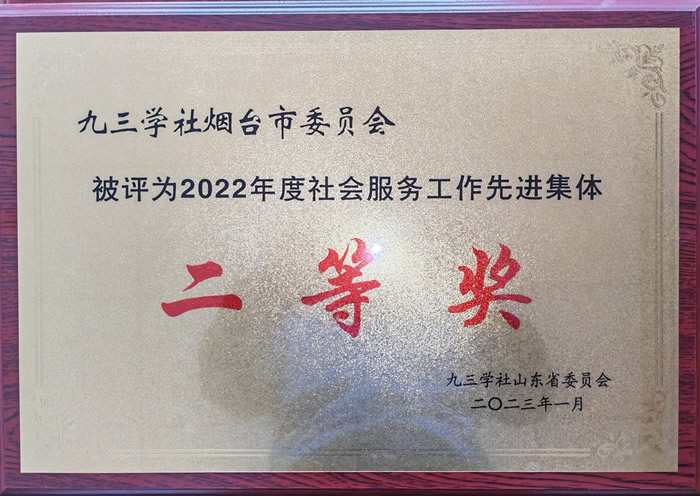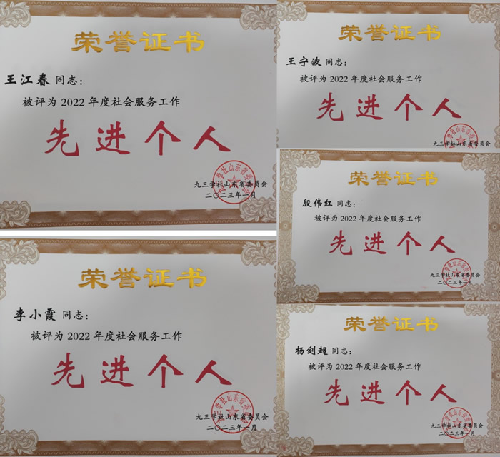 市委会荣获九三学社山东省2022年度社会服务工作先进集体二等奖,王江春、杨剑超、李小霞、殷伟红、王宁波荣获九三学社山东省2022年度社务服务工作先进个人。