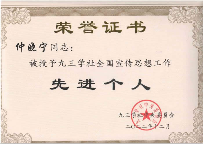 仲晓宁荣获九三学社中央全国宣传思想工作先进个人。
