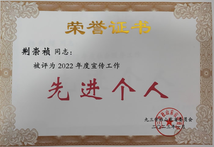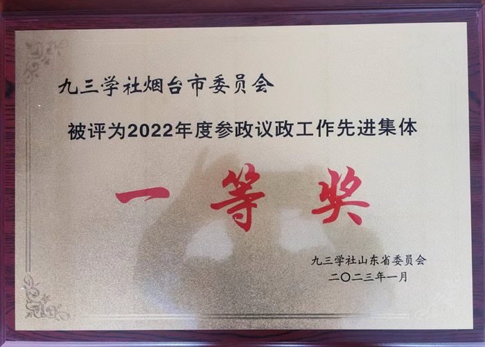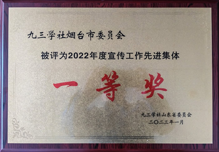 市委会荣获九三学社山东省2022年度宣传工作先进集体一等奖,荆崇祯荣获九三学社山东省2022年度宣传工作先进个人。