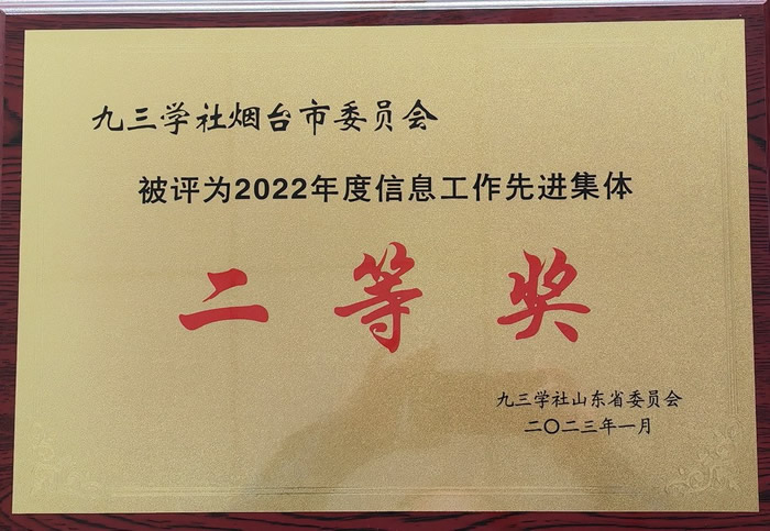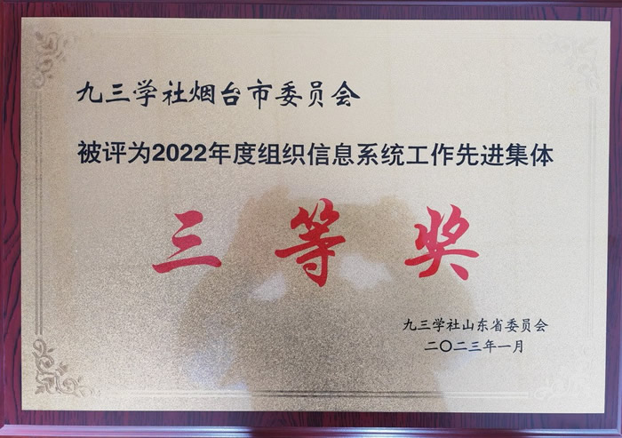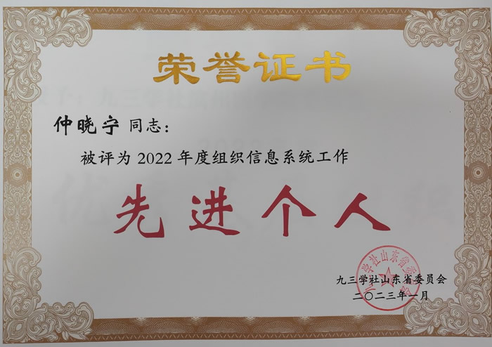 市委会荣获九三学社山东省2022年度组织信息系统工作先进集体三等奖,仲晓宁荣获九三学社山东省2022年度组织信息系统工作先进个人。