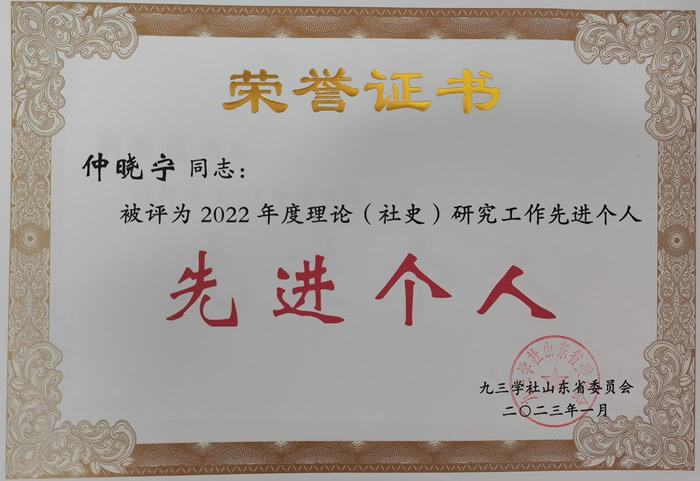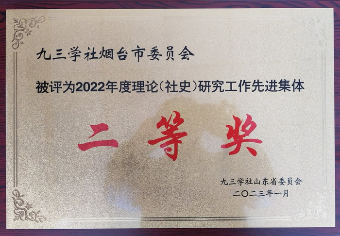 市委会荣获九三学社山东省2022年度理论(社史)研究工作先进集体二等奖,仲晓宁荣获九三学社山东省2022年度理论(社史)研究工作先进个人。