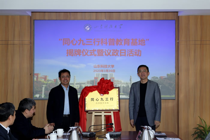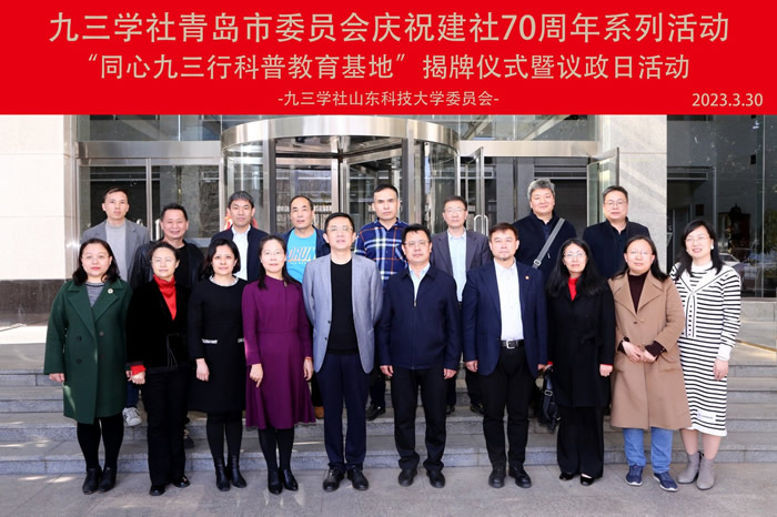 盛春时节,百花绚烂。3月30日下午,九三学社青岛地方组织成立70周年系列活动——“同心九三行科普教育基地”揭牌仪式暨议政日活动在山东科技大学办公楼第二会议室举行。九三学社青岛市委会秘书长王波、学校统战部常务副部长王永君出席揭牌仪式。九三学社青岛市委会副秘书长刘宝霞、办公室主任刘春玉、科普工作专委会主任郎云鹏和副主任张钢,学校统战部副部长于娜以及九三学社部分社员共20余人参加了活动。活动由九三学社山东科技大学委员会主委高艳丽主持。