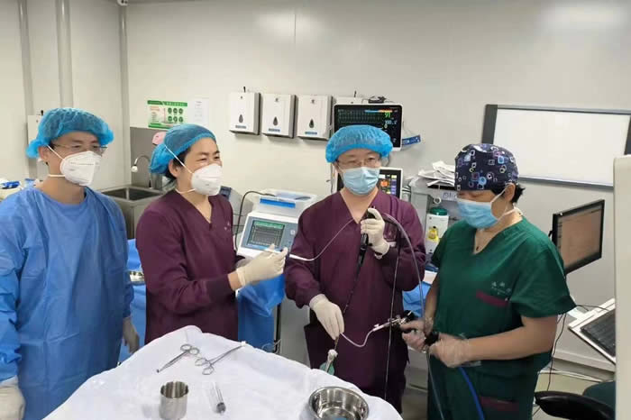 姜廷枢(右二)为患者进行气管镜检查