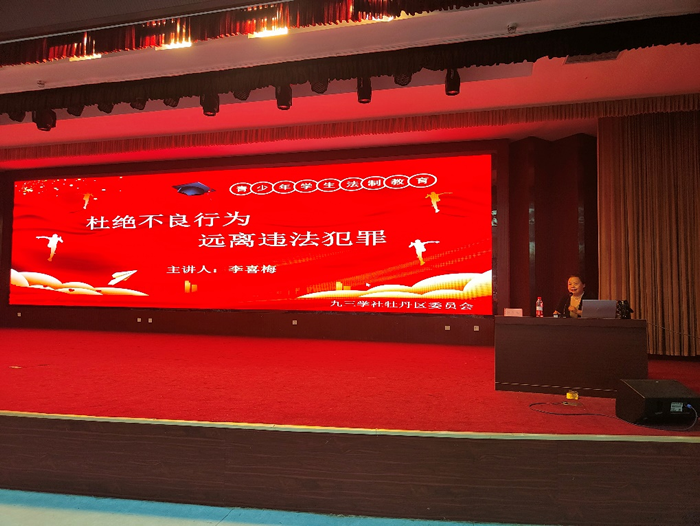 为进一步加强未成年人法治宣传教育,增强青少年法治观念,预防未成年人违法犯罪,9月18日,九三学社菏泽市委员会在菏泽工程技师学院举办“杜绝不良行为 远离违法犯罪”专题法制讲座,牡丹区邦治律师事务所副主任、九三学社社员李喜梅担任主讲嘉宾,牡丹区政协副主席、社菏泽市牡丹区委员会主委刘铮、部分骨干社员和学校600多名师生参与活动。