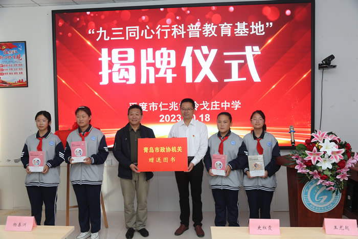 10月18日,秋高气爽,丹桂飘香。青岛市政协、九三学社青岛市委员会、九三学社陇南市基层委员会组织专家赴平度市仁兆镇冷戈庄中学、小学联合举办“同心九三行科普教育基地”揭牌仪式和“同心九三行科普教育讲堂”。市政协人口资源环境工作办公室主任史红霞,陇南市政协副主席、九三学社陇南市基层委员会主委杨春洲,市政协机关党委专职副书记王尤起,九三学社青岛市委会秘书长王波等参加活动,共同为“同心九三行科普教育基地”揭牌。