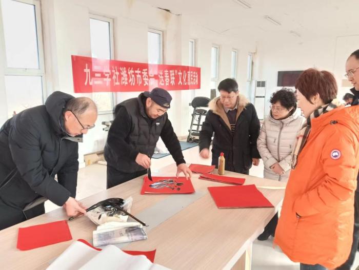 活动现场,奎文支社社员、中国画院签约画家、北京美术家协会会员方怀富带领多名书法家,为当地群众书写300副春联或福字,送“福”到家。