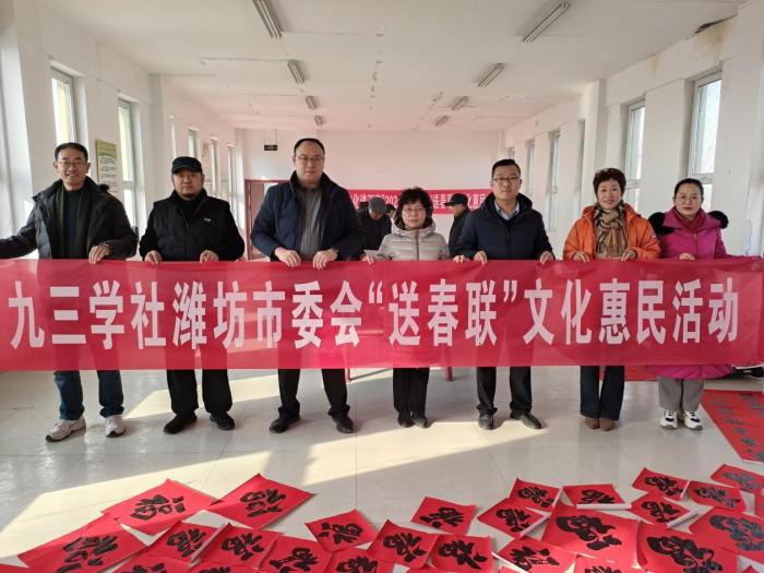 1月27日,九三学社潍坊市委会赴峡山区王家庄街道朱子社区开展“送春联”文化惠民活动。社市委会副主委李莉带队,社市委会委员、奎文支社主委岳连红,支社委员王新忠,社员方怀富、殷晓燕参加。峡山区王家庄街道党委副书记王晓勇,街道组织委员、朱子社区书记李传涛陪同活动。