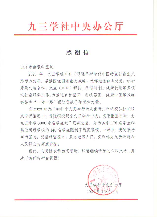 2023年,社省委会积极响应社中央号召,协调鲁南制药有限公司,向社中央对口帮扶地区四川旺苍捐赠抗疫药品。山东鲁南眼科医院积极配合社中央、社省委会工作,为贵州威宁亮康行动儿童青少年近视防控工程作出贡献。社中央对以上两项工作特别发信感谢。(社省委会 刘佩)