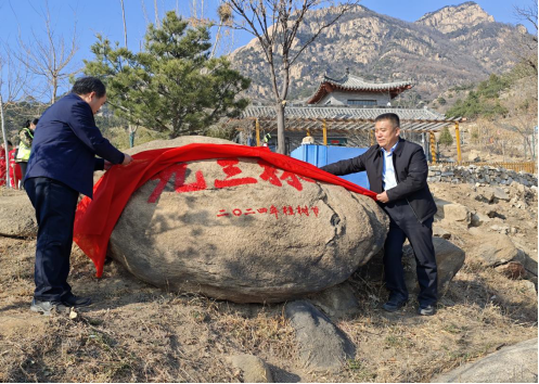 郭启明、彭福田为泰山“九三林”揭幕,九三学社泰安书画院副院长、中国书法家协会会员张廷栋书写“九三林”。植树现场,大家分工协作,挖坑、扶苗、培土、浇水,经过一下午的栽植,本是荒地的梯田,种上了两层桃树和柿子树,与上方刻有“九三林”的泰山石相呼应。