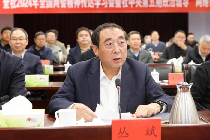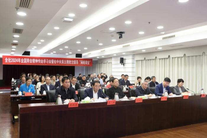 丛斌在主持时指出,学习贯彻全国两会精神,是九三学社当前和今后一个时期的重要政治任务,也是巩固拓展“凝心铸魂强根基,团结奋进新征程”主题教育成果的必然要求。今年两会的主要任务是鼓舞士气,团结一致,认清形势,直面困难和挑战,在以习近平同志为核心的党中央坚强领导下,完成今年的预定目标和工作任务,发展新质生产力,以优异的成绩迎接中华人民共和国成立75周年。他强调,受武维华主席委托,提三点要求:一是要在认真学习贯彻上下功夫。全社各级组织要灵活运用多种载体平台,推动学习活动往实里走、往深里走,入脑入心。二是要在加强自身建设上下功夫。要把坚持好发展好完善好中国新型政党制度要求落在实处,进一步加强思想政治建设,筑牢坚持中国共产党领导的思想政治基础;进一步加强组织建设,改进思想作风和工作作风,不断提升履职能力和水平。三是要在发挥特色优势上下功夫。要聚焦发展新质生产力和推动高质量发展,发挥特色优势,加强调查研究,着力寻找打通束缚新质生产力发展的堵点卡点,积极建言资政,以高水平履职助力高质量发展。