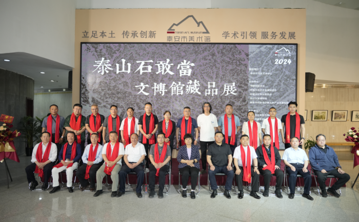开幕式上,中国文化艺术发展促进会收藏专业委员会主任古方,泰安市美术馆(泰山画院)馆长(院长)冯晓东,泰山学院教授、奉高书院院长、泛华文博发展集团董事长王恒明分别致辞,九三学社泰山区支社社员、泰山石敢当文博馆馆长、石敢当小镇文旅产业发展有限公司董事长卢宏刚向泰安市美术馆捐赠“长城永固,护我山河”泰山石敢当朱砂红拓片。