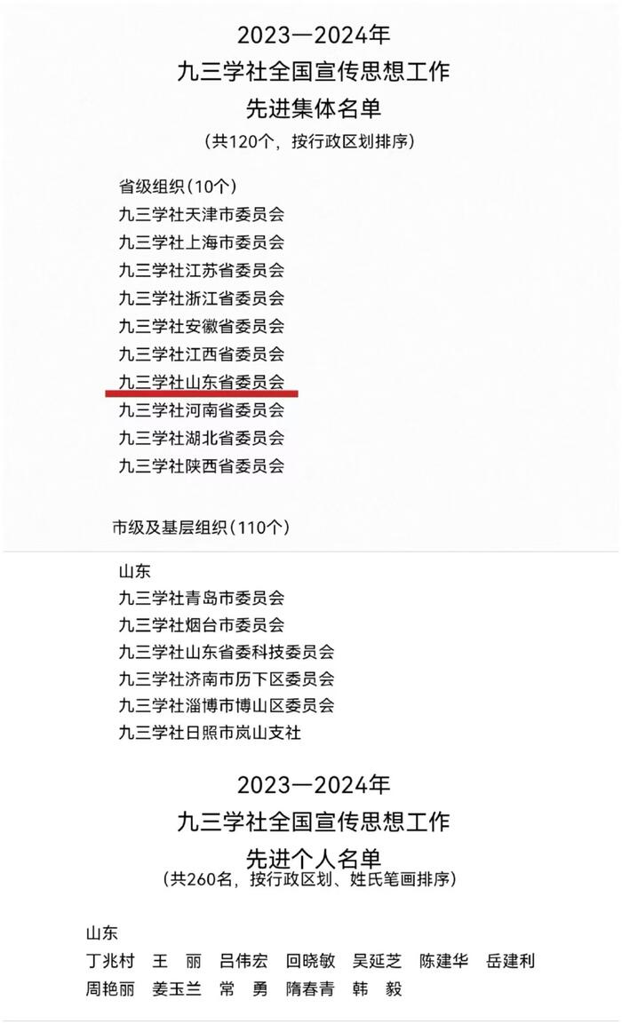 会议表彰了2023—2024年九三学社全国宣传思想工作先进集体和先进个人,为2023年度《民主与科学》杂志发行工作先进集体和先进个人代表颁奖。社山东省委会、青岛市委会、烟台市委会、省科技委员会、济南市历下区委员会、淄博市博山区委员会和日照市岚山支社获评宣传思想工作先进集体,丁兆村等12名同志获评宣传思想工作先进个人。社潍坊市滨海支社、枣庄高新区支社、枣庄市市中区支社、枣庄市直卫生支社获评2023年度《民主与科学》杂志发行工作先进集体,王秀娟等4名同志获评2023年度《民主与科学》杂志发行工作先进个人。 社山东省委会专职副主委李宗涛、宣传部部长陈琰,社济南市委会专职副主委赵宁,社青岛市委会专职副主委于鹏,社烟台市委会专职副主委张桂德,社中央思想建设研究中心研究员回晓敏参加会议。来自九三学社全国各省组织宣传思想工作分管领导、宣传部门负责人,部分市级组织代表,社中央文化工作委员会、思想建设研究中心代表,民主与科学杂志社、学苑出版社代表等120余人参加会议。(社省委会宣传部供稿) |