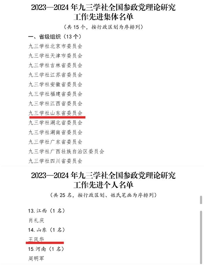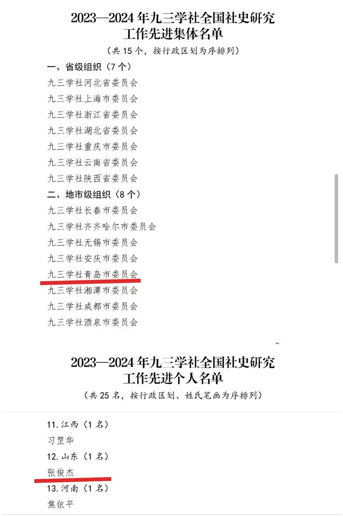 近日,九三学社中央印发《关于表彰2023-2024九三学社全国参政党理论和社史研究工作先进集体和先进个人的决定》,社省委会荣获“2023—2024年九三学社全国参政党理论研究工作先进集体”荣誉称号,王风华被授予“2023—2024年九三学社全国参政党理论研究工作先进个人”荣誉称号。社青岛市委会荣获“2023—2024年九三学社全国社史研究工作先进集体”荣誉称号,张俊杰荣被授予“2023—2024年九三学社全国社史研究工作先进个人”荣誉称号。