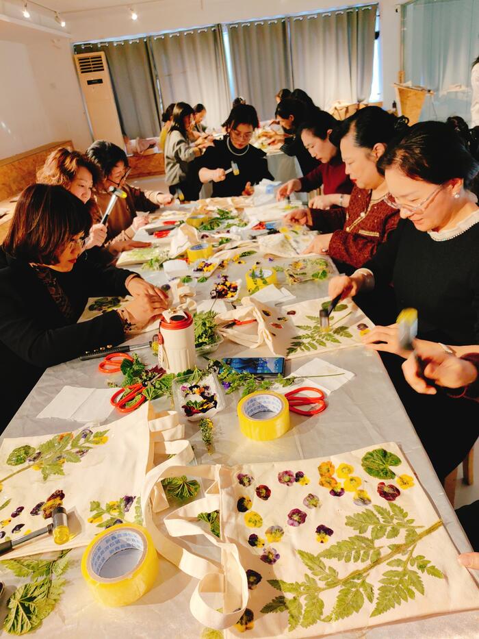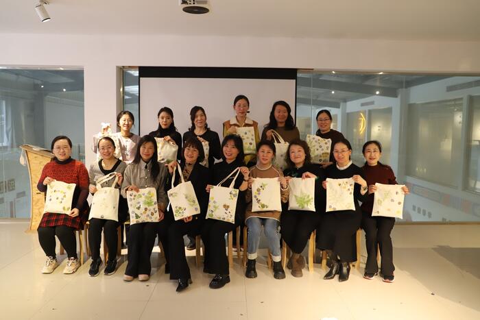活动现场,女社员们参观了济宁市鲁班木艺研究中心,了解了木艺的发展和传承,在工作人员的专业指导下,积极参与植物敲拓染制作。大家纷纷动手尝试,将新鲜的植物叶片放置在织物上,用小锤轻轻敲击,使植物的汁液渗透到织物中,形成独特而美丽的图案。在制作过程中,大家充分展现创造力和想象力,互相交流心得,分享创作乐趣,深刻感受到传统手工艺的魅力。