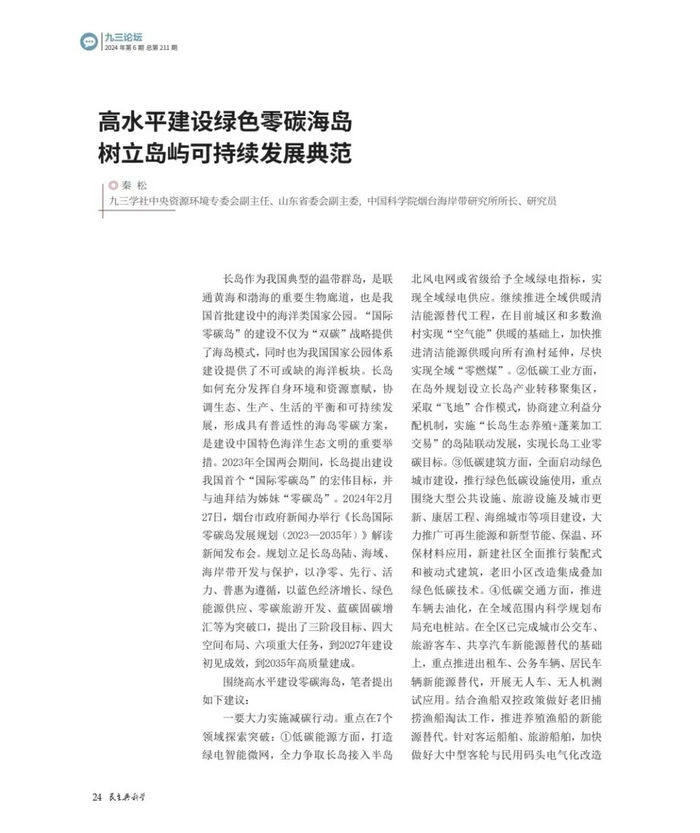 【编者按】近日,九三学社烟台市委员会主委秦松文章《高水平建设绿色零碳海岛 树立岛屿可持续发展典范》在《民主与科学》2024年第6期刊发。以下为文章内容: