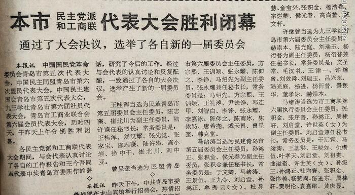 1984年3月25日,《青岛日报》刊登了九三学社青岛市第六次社员代表大会的消息,原件在青岛市图书馆。 1984年3月24日-27日,九三学社青岛市第六次社员代表大会在青岛市政协礼堂(太平路29号)召开。大会选举产生了九三学社青岛市第六届委员会。主任委员:许继曾;副主任委员:赫崇本、陆光庭、刘瑞玉、杨衍普;秘书长:杨衍普(兼);常务委员13人;委员27人。时有社员209人、8个基层组织。通过本次代表大会,九三学社青岛分社更名为九三学社青岛市委员会。