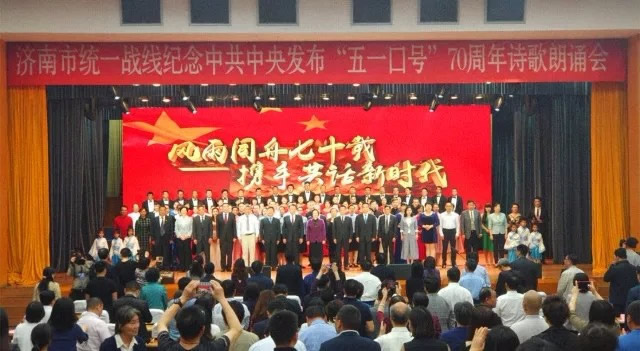 5月4日,“风雨同舟七十载,携手共话新时代”——济南市统一战线纪念中共中央发布“五一口号”70周年诗歌朗诵会在舜耕会堂举办。 朗诵会以一首由市委统战部机关、各民主党派市委会机关和济南市台联机关干部共同演绎的诗歌朗诵《走向共和国》拉开帷幕,随后市级各民主党派、无党派人士创作及表演了10个精彩节目,回顾了70年来中国共产党与各民主党派和无党派人士风雨同舟、肝胆相照、荣辱与共、和衷共济的光辉历程,展示了70年来多党合作事业发展的辉煌成就,展现了我市统一战线成员不忘合作初心、继续携手前进,坚定不移跟党走,在新时代实现新作为的信心和决心。最后,朗诵会在一首气势恢宏、振奋人心的《没有共产党就没有新中国》大合唱中圆满结束。 社济南市委主委刘梦海、副主委兼秘书长陈宁宁参加活动,社员甘超、胥莉创作并表演了《我骄傲我是中国人》,杨婷婷参与主持。  |