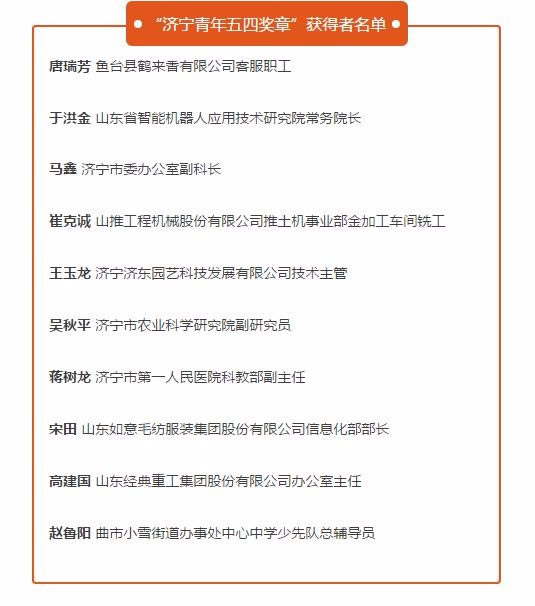 “济宁青年五四奖章”是共青团济宁市委、济宁市青年联合会授予我市优秀青年的最高荣誉,旨在树立可学可亲可敬的青年典型,反映济宁当代青年的精神品格和价值追求,引领全市广大青年为实现全面建成小康、全面转型振兴做出新的更大贡献。