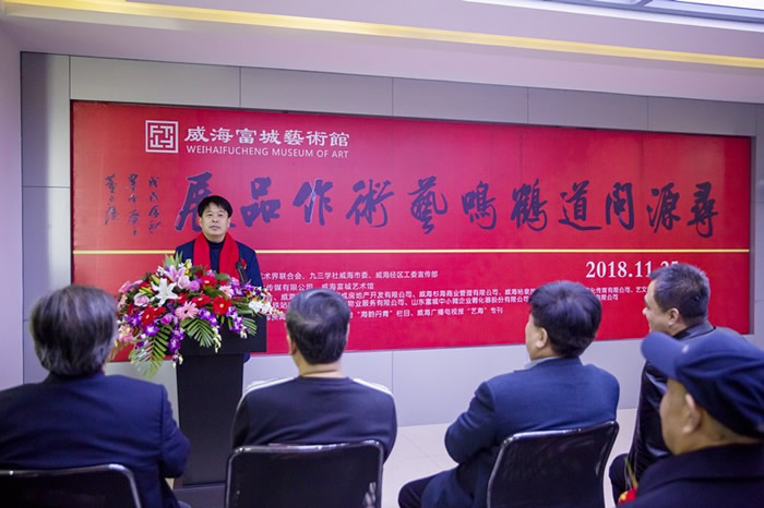 2018年11月25日,九三学社威海市委、威海市文联在威海富城艺术馆举办“寻源问道”时鹤鸣艺术作品展,社威海市委主委贾国哲、威海市文学艺术界联合会主席张建岭、威海市工商联副主席苗建臣、九三学社社员、书画界同仁,共计二百余人参加了画展。