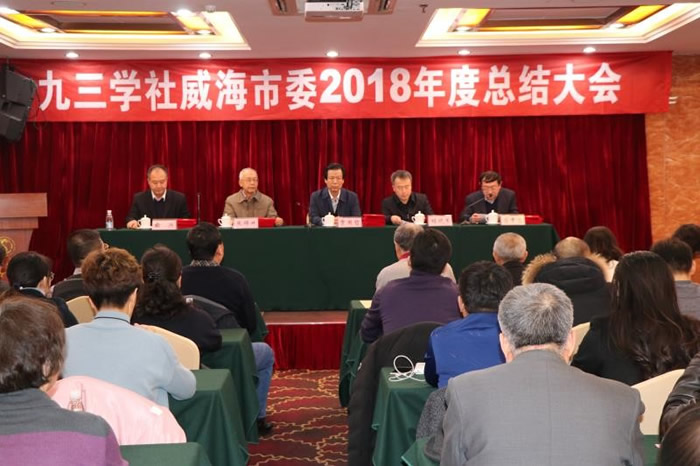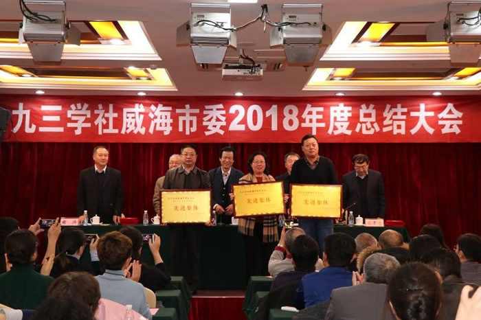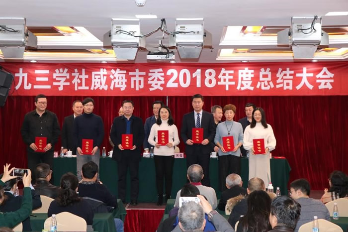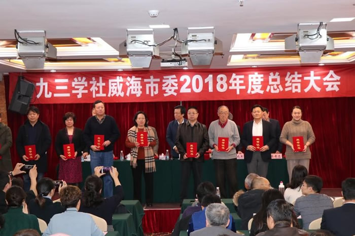 1月19日,九三学社威海市委2018年度总结大会在市阳光大厦隆重召开,会议由社威海市委副主委高孝忠主持,社威海市委领导和社员近100人参加了会议。 会上,各支社主委分别作了2018年工作总结和交流,贾国哲主委作了九三学社威海市委2018年工作总结和2019年工作计划,表彰了一批表现突出的先进支社和优秀社员,中共威海市委统战部副部长程晓军出席会议并作重要讲话。    贾国哲主委在工作总结时指出,2018年,在中共威海市委和九三学社山东省委的领导下,在中共威海市委统战部的大力支持下,在全体社员的共同努力下,社威海市委继续推进参政议政、参政党理论研究、培育和践行参政党政治美德“三大品牌”建设,各项工作取得了显著成效。一是不断强化政治引领,思想建设达到新高度;二是不断深入参政党理论研究,成果丰硕收到各方关注和赞誉;三是着力加强调查研究,切实履行参政党职能;四是加强组织建设,提高组织凝聚力号召力战斗力;五是加强宣传工作,不断扩大影响力;六是着力开展社会服务,树立良好社会形象。贾国哲主委在客观地分析了工作中存在的不足的同时,要求:2019年,社威海市委要继续坚定政治方向,积极进取、开拓创新,全力以赴推动各项社务工作再上新台阶。一是深入学习贯彻习近平新时代中国特色社会主义思想,推进主题教育活动;二是继续深入推进参政党理论研究工作,进一步发挥增知明理指导实践的作用;三是深入开展调查研究,着力提高履职能力和实效;四是充分发挥社员优势,继续做好社会服务工作;五是继续加强组织建设,为社的工作提供有力保障。