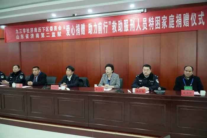 2019年1月23日下午,九三学社济南市委、历下区委员会与济南第二监狱以“爱心捐赠,助力前行”为主题,在济南第二监狱联合开展救助服刑人员特困家庭捐赠活动。济南市人大常委、九三学社济南市委副主委兼秘书长陈宁宁,济南市政协常委、九三学社济南市委副主委王文生,济南市司法局党委书记、局长谢圣仁等出席捐赠仪式。九三学社历下区委员会部分成员、济南第二监狱主要领导以及市司法局有关部门负责人、媒体记者、监狱民警代表、服刑人员亲属代表、全体服刑人员参加活动。