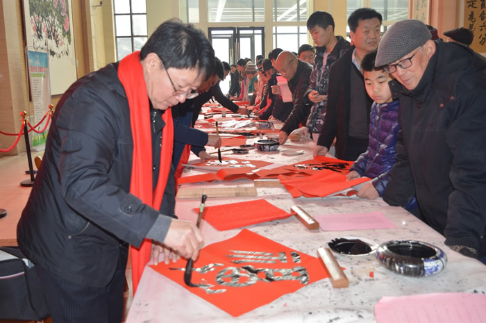 活动现场,山东省书法家协会副主席、菏泽市书法家协会主席、九三学社菏泽市委五支社主委曹钰,中国书法家协会会员、九三学社菏泽市委五支社社员张伟杰,以及菏泽市书法家协会10余名书法家齐聚菏泽市图书馆一楼大厅,挥毫泼墨,为群众现场书写“福”字和春联,前来领取春联的群众围在书桌前排队等候,观摩书法家创作,等待书法家为他们送“福”,一张张飘着墨香的“福”字,一幅幅苍劲有力的春联作品,寄托着书法家们和广大人民群众对即将到来的“猪年”春节的美好祝福和祈愿。书法家们现场书写福字、春联1000余副,也将新春祝福和美好祝愿传送到千家万户。