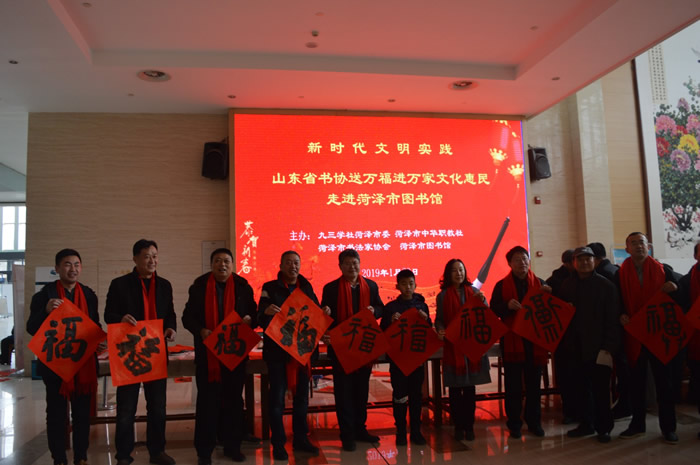 2019年1月29日,九三学社菏泽市委、菏泽市中华职教社、菏泽市书法家协会、菏泽市图书馆共同举办了“送万福进万家文化惠民走进菏泽市图书馆”活动。菏泽市委统战部副部长、市社会主义学院常务副院长、市中华职教社常务副主任王敏,九三学社菏泽市委员会副主委张传新参加活动,并向群众赠送“福”字。