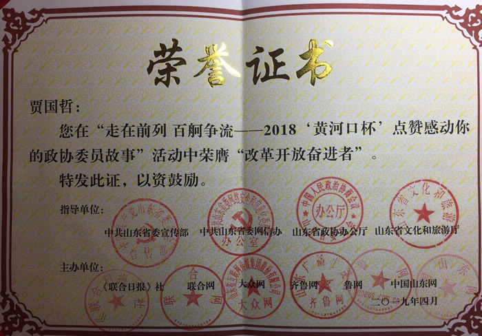九三学社威海市委主委贾国哲“走在前列 百舸争流——2018‘黄河口杯’点赞感动你的政协委员故事”活动中荣获“改革开放奋进者”奖。(社威海市委 王志远)