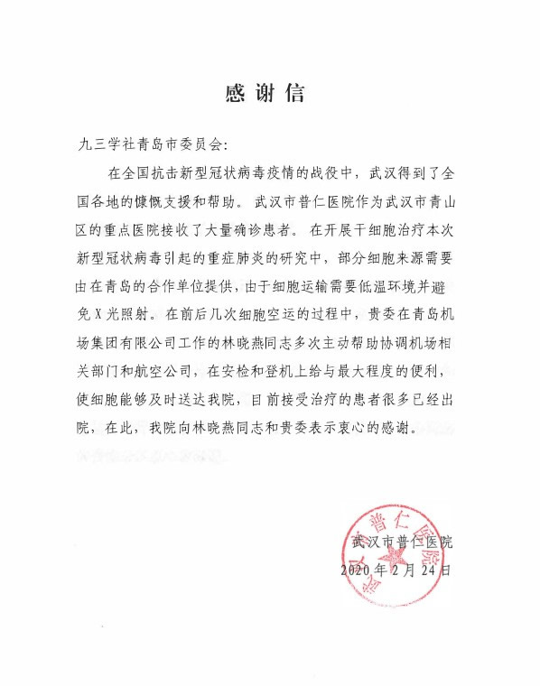 2月24日,九三学社青岛市委员会收到一封来自武汉市普仁医院的感谢信,专门感谢青岛九三社员林晓燕为青岛、武汉两地间充质干细胞运输所做的贡献。