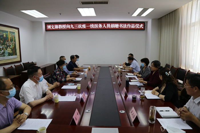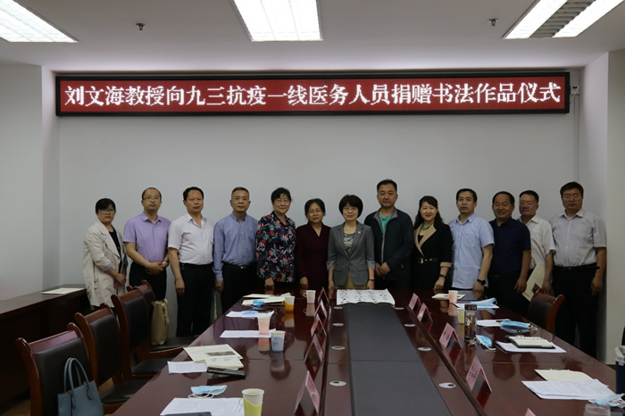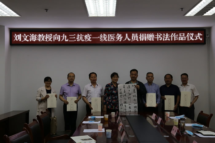 2020年5月22日下午,九三学社德州市委举行了“刘文海教授向抗疫一线医务人员捐赠书法作品仪式”,德州市人大常委会副主任、社德州市委主委钟玲,副主委郭天德、张兰菊,秘书长戴连强出席仪式,德城区人大常委会副主任、社德州市委副主委李和平主持会议。